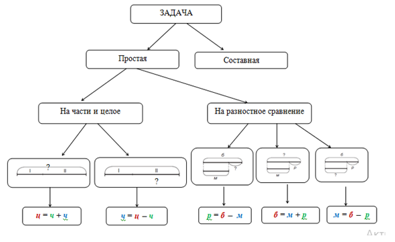 - Какими бывают простые задачи? - Что может быть неизвестным в задачах на части и целое? - Что может быть неизвестным в задачах на разностное сравнение? - А зачем вам такая схема?