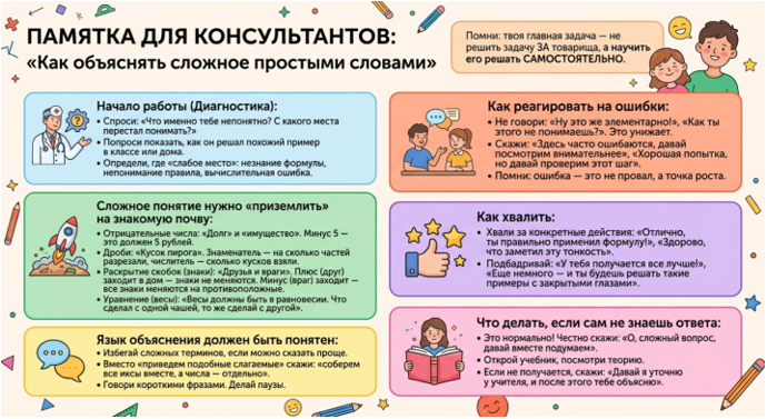 Консультации проводятся во внеурочное время. Оптимальный режим 1-2 раза в неделю по 40-60 минут. Важно, чтобы это время было удобно и консультантам, и их подопечным (не в ущерб их собственным урокам и отдыху). Место проведения - закрепленный школьный кабинет, где есть доска, парты для парной работы, доступ к справочным материалам. Целесообразно составить гибкий график дежурства консультантов, вывесив его на стенде. Это дисциплинирует всех участников образовательного процесса и делает систему прозрачной. Двери консультационного центра открыты для всех желающих, независимо от класса. Можно приходить с любым вопросом по математике. Это создает атмосферу доступности. Для эффективной работы группы необходимо обеспечить дидактическими материалами (банк карточек-заданий, которые должны быть разноуровневыми и содержать не только примеры, но и краткие теоретические подсказки, алгоритмы действий, образцы решений; небольшие листы с заданиями, которые помогают консультанту быстро выявить, какая именно тема «провалена» у пришедшего ученика (например, тест на знание таблицы умножения или правил работы с дробями).